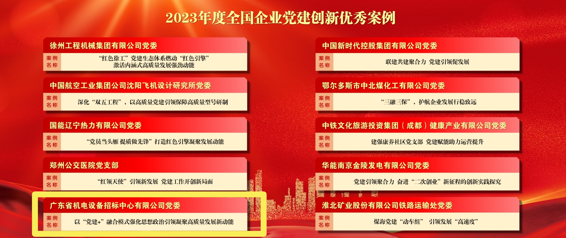 本次研讨会由求是网指导,由全国企业党建创新优秀案例征集活动发起单位——《中国企业报》集团、北京大学马克思主义学院、红旗出版社共同主办,由中企党建研究院承办。开云app登录入口党委《以“党建+”融合模式强化思想政治引领 凝聚高质量发展新动能》案例被评选为“2023年度全国企业党建创新优秀案例”。全国共评选优秀案例360个,其中广东37个,招标中心是全国招投标行业唯一入选企业。