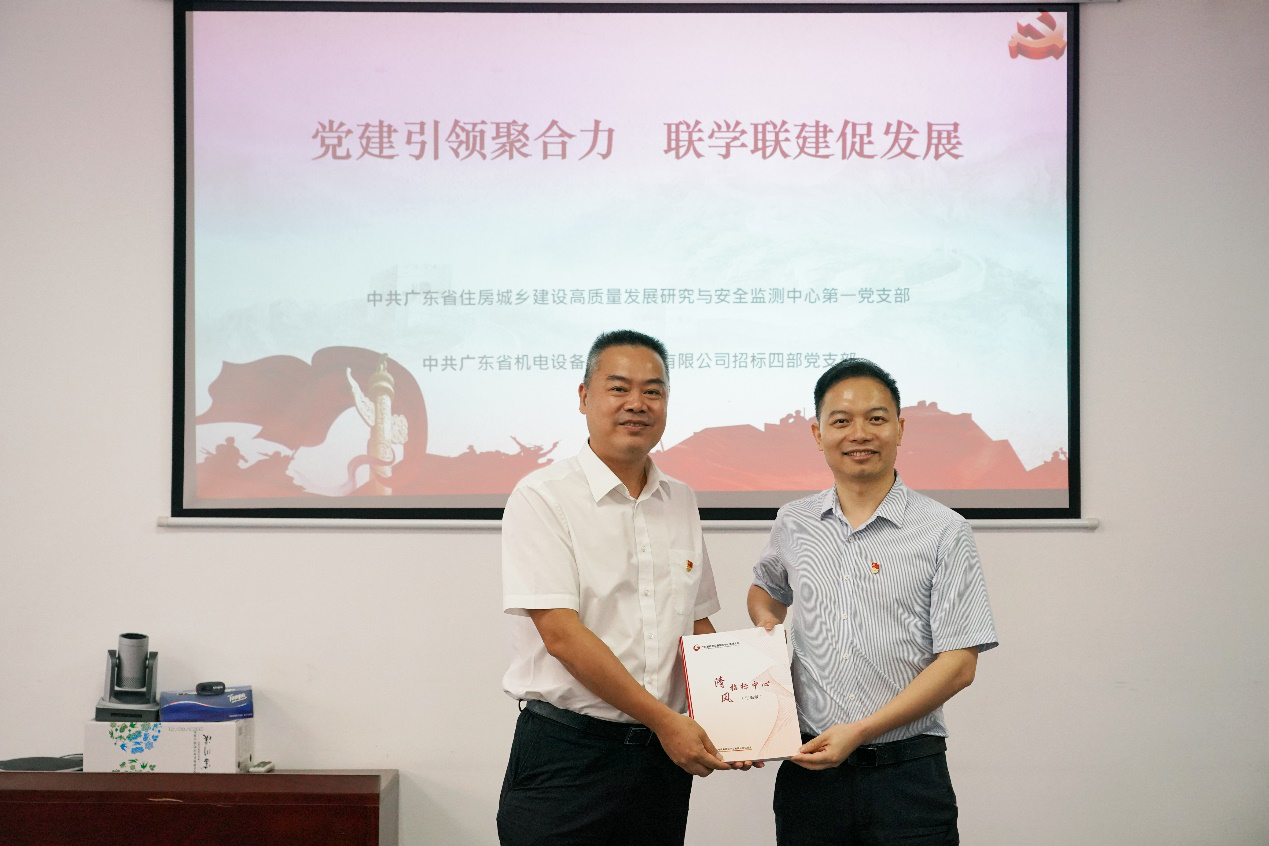 在“七一”建党节来临之际,为庆祝中国共产党成立103周年,6月28日上午,开云app登录入口(以下简称招标中心)招标四部党支部、广东省住房城乡建设高质量发展研究与安全监测中心(以下简称发展与安全中心)第一党支部开展“党建引领聚合力 联学联建促发展”为主题的党建共建活动。招标中心党总支书记、执行董事、总经理邹吉炎接待了来访人员。发展与安全中心党总支书记黄守新以及双方有关人员参加了本次活动。